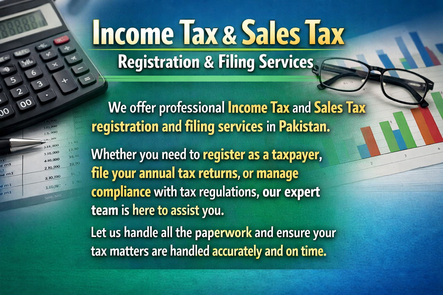 We provide comprehensive Income Tax and Sales Tax registration and filing services in Pakistan, helping individuals, freelancers, and businesses stay fully compliant with the regulations of the Federal Board of Revenue (FBR). Our expert team assists in NTN registration, sales tax registration, monthly and annual return filing, and maintaining proper tax records to avoid penalties and legal issues. Whether you are starting a new business or need to regularize your tax status, we ensure a smooth, hassle-free process with accurate documentation and timely submissions. With our professional support, you can focus on growing your business while we handle all your tax-related matters efficiently and reliably.